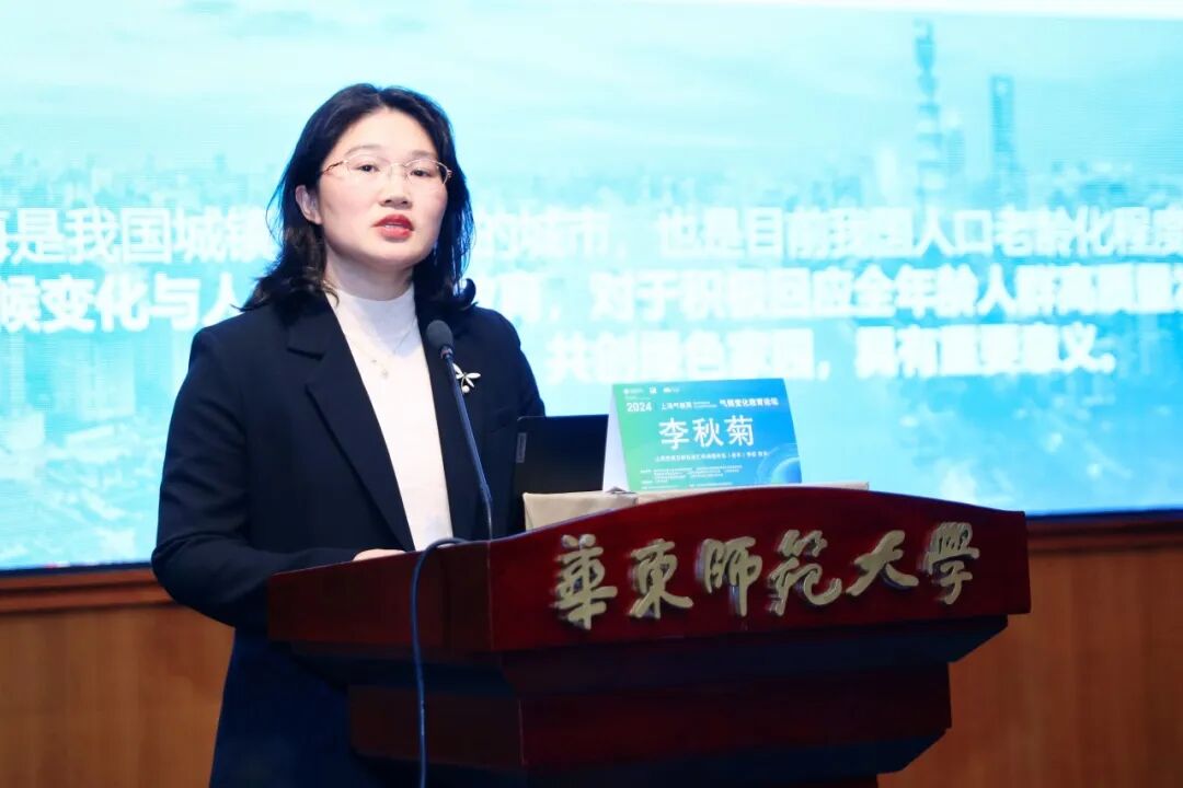 上海市浦东新区南汇新城镇社区(老年)学校李秋菊校长以《绿色创新与气候教育,构建终身学习新典范》为题进行汇报,针对不同年龄人群对气候变化感知的差异性,阐述了南汇新城推进气候变化教育方面的实践和思考,强调了绿色科创与气候变化教育的重要性。