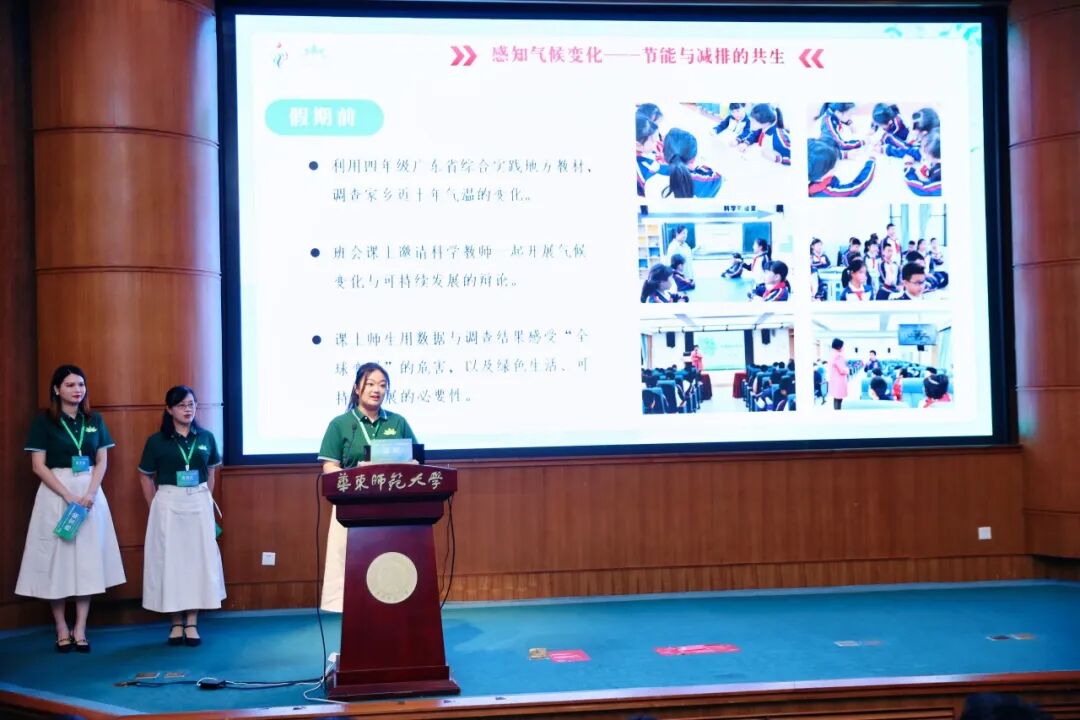 广东省佛山市禅城区东华里小学蓝虹老师、广东省佛山市禅城区南庄镇紫南小学陈宝瑜老师、广东省佛山市城南小学莫美红老师共同围绕《小学教育,能为气候变化做些什么?——以佛山市禅城区校家社联动“气候变化”项目式活动为例》的主题进行了分享,分别讲述了节能与减排共生、鸟类与气候共舞、黄皮与气候共美的教育实践案例。